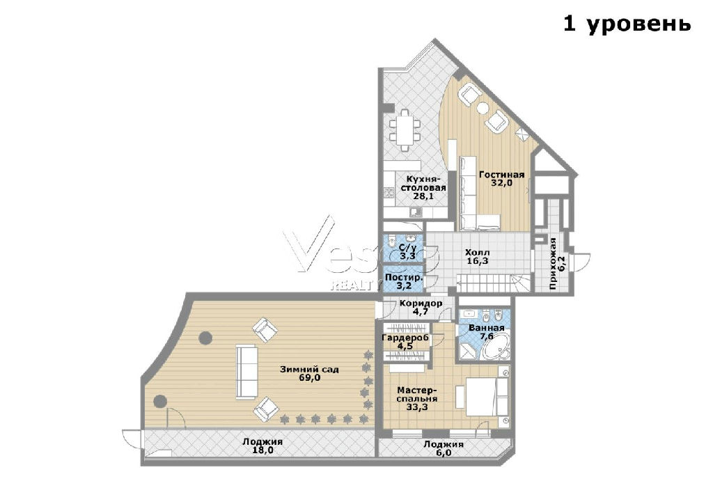 1-ый уровень: гостиная (32), кухня-столовая (28,1), зимний сад (69) с выходом на лоджию (18), мастер-спальня (33,3) с гардеробной (4,5), ванной комнатой (7,6) и выходом на лоджию (6), гостевой с/у (3,3), постирочная (3,2), прихожая (6,2), холл (16,3), коридор (4,7).