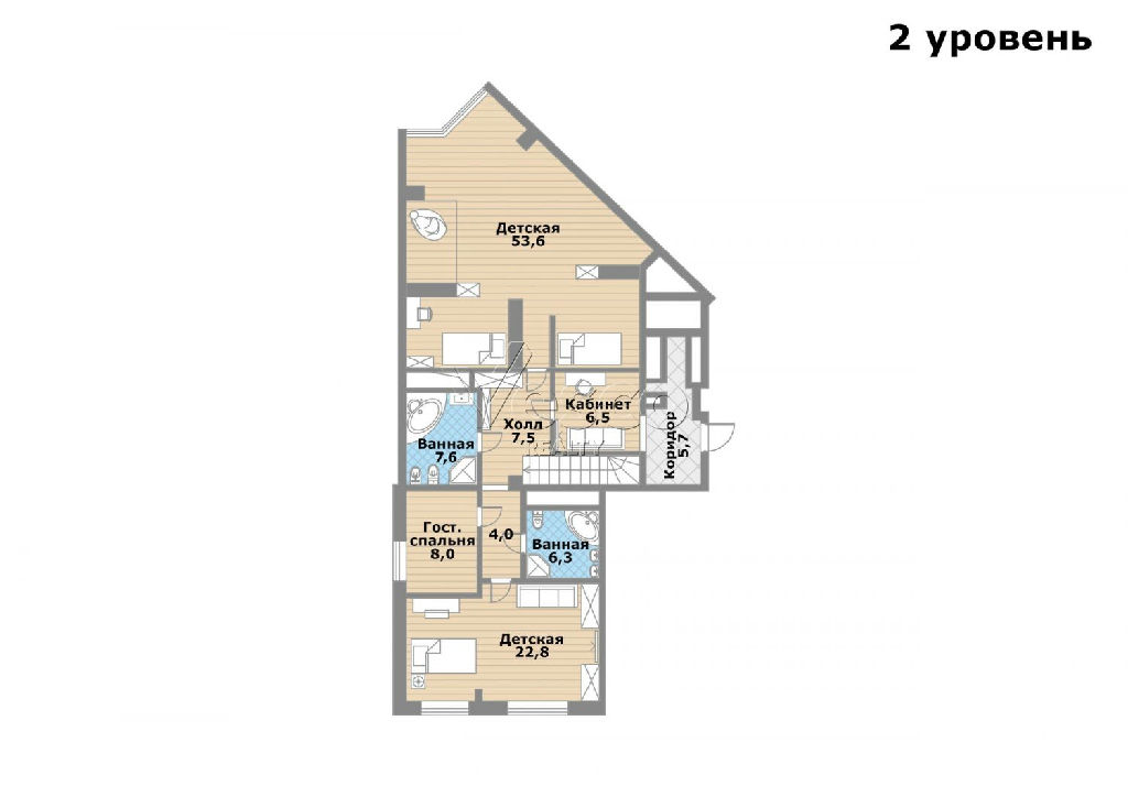 2-ой уровень: детская 1 (53,6) с ванной комнатой (7,6), детская 2 (22,8) с ванной комнатой (6,3), кабинет (6,5), гостевая спальня (8), комната свободного назначения (3), холл (7,5 + 4), коридор (5,7).